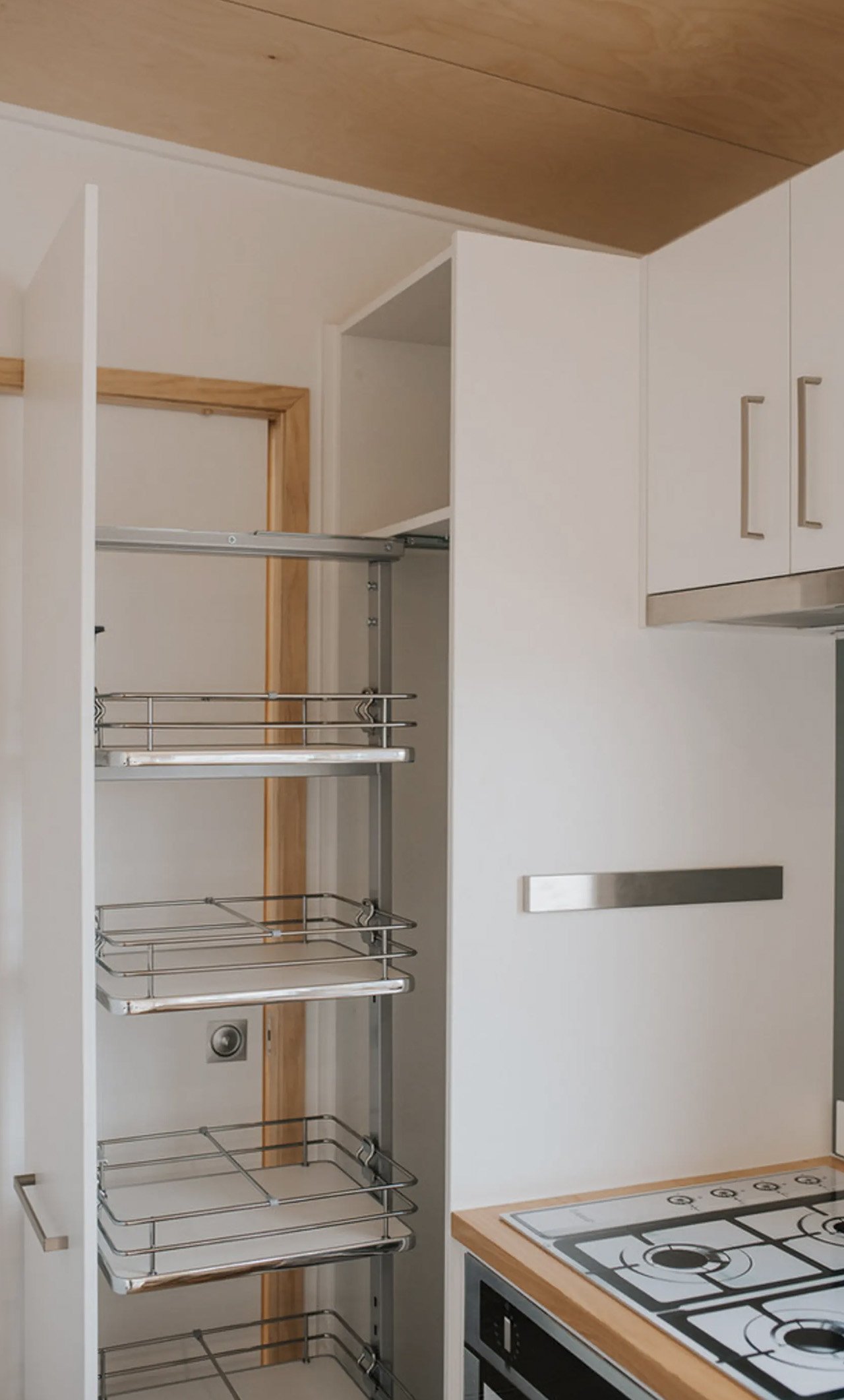 Located close is the kitchen, and it is quite spacious for a New Zealand tiny house. It features a fridge/freezer, microwave, sink, as well as an oven with a four-burner propane-powered stove. The kitchen also includes standard cabinetry, overhead cabinets, a pull-out pantry drawer, as well as a breakfast bar that can accommodate two people. The kitchen and bathroom are connected, and the bathroom is equipped with a composting toilet, vanity sink, shower, and washing machine.